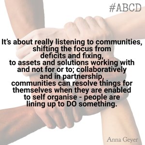 Last week, I was lucky to share a powerful couple of hours on zoom with over 120 other people across the UK who are working with their communities to bring positive change. It was called the Asset Based Community Development Jamboree – hence the ABCD heading to this blog. Don’t get put off with fancy words there – what this really means is strengthening communities with what exists already – i.e. the people. To put it another way, as it says in our mission statement, empowering local people & organisations to bring about positive, lasting change. What this boils down to is a community revolution! It’s the time for communities to build on their own skills and be the authors of their own futures.