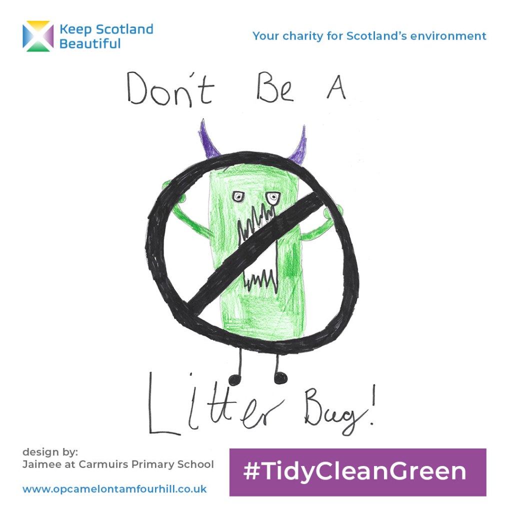 The final action that I want to highlight is the new posters and signage that will be going up around the Camelon and Tamfourhill areas, it has a truly clear message and to remind everyone here is the competition wining drawing from Jaimee who is a Primary 7 pupil at Carmuirs Primary School, please keep an eye out for this character appearing on a rubbish bin near you.