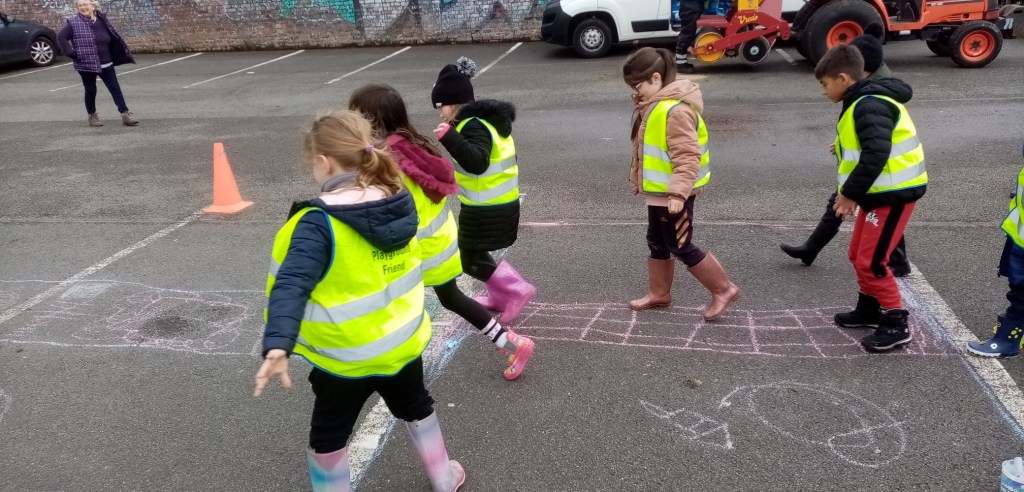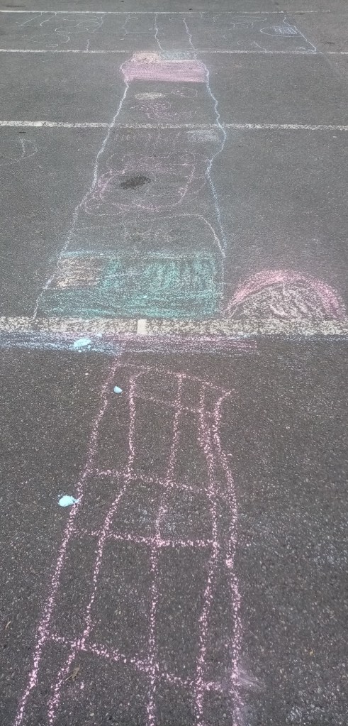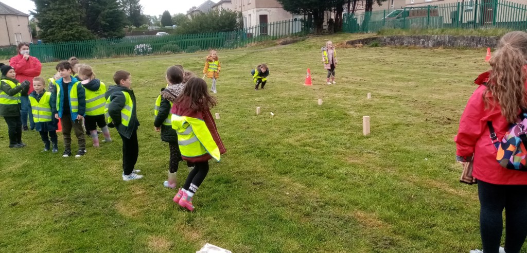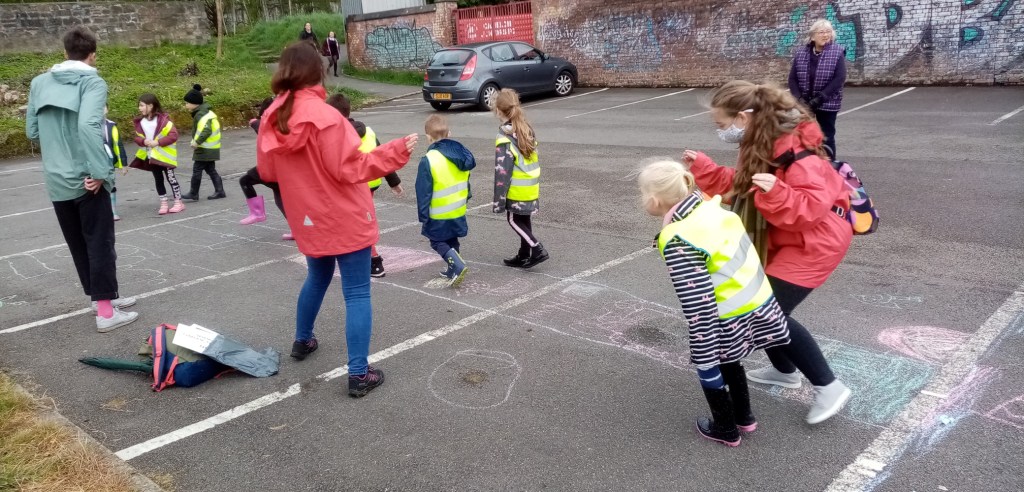 The second half kicked off at 2pm in the car park at Camelon Juniors Football Club. This activity was called All Games Allowed, and this title was to contrast the usual no games allowed signs that we see far too often throughout our local communities. The aim was to look at how the Primary 3 pupils might make use of the space for safe paly and to encourage them to invent their own games based on the traditional street and pavement games that go back generations. We started with Mark form Camelon Arts inviting us all to try an ancient Viking game called: Kubb and this was great fun, extremely competitive, it involved knocking out skittles and eventually the game would be won through somebody knocking out the king which happened on several occasions.