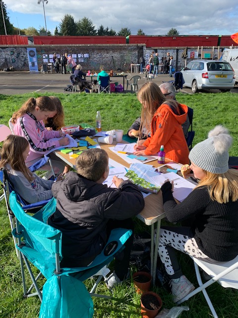 The autumnal sun shone on a day of greening , creativity and safe place making at the car park area of Camelon Juniors Football Club. The location historically has had a negative reputation for anti-social behaviour, so the Community Safety Event: Gather & Play was organised to encourage a new perception and experience of how the location could be used safely and redeveloped for the betterment of the local community. Camelon Arts Project facilitated workshops which focused upon hands on creativity that identified themes which could be further developed into local permanent public art works , they also provided tote bag designing and a display of local peoples sign writing and these activities all contributed to the days creative themes. A community artist led an all Games Allowed session which involved inventing new streets games and the Tidy, Clean and Green Group provided a pop-up park with children’s games and a bulb planting stall. There was a very informative stall form Frog life, and the staff and young learners form Camelon Early Years and Childcare centre had a detailed exhibition of their community involvement.