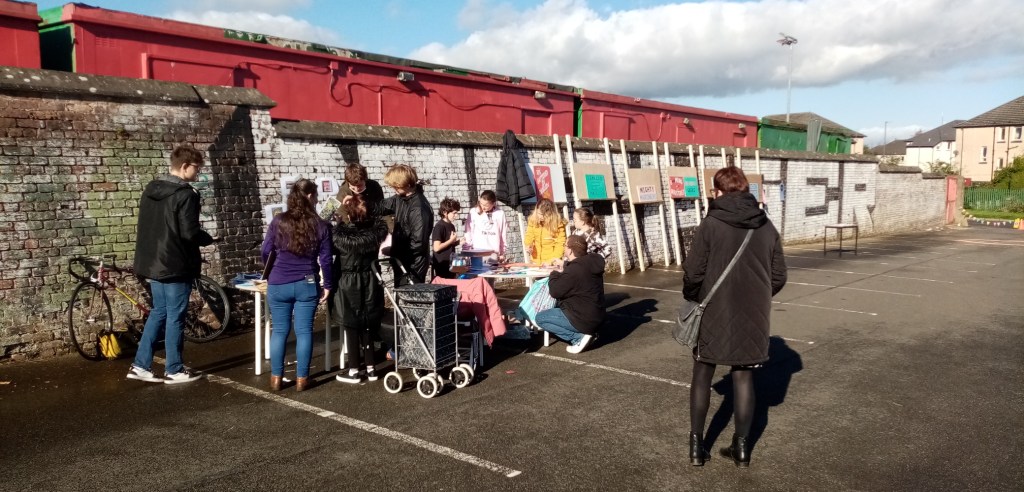 This community event was all about participation and imagining the place as being a completely different social space. Our colleagues form Camelon Arts facilitated workshops looking at how the perimeter wall of the football ground could be converted into a community mural, the Tidy, Clean, and Green group provided a pop-up park with children’s games, there was bulb planting and an information stall form frog life. An “all games allowed” activity involving children and young people creating their own street games took place on the car park surface and there was food and refreshments provided by the Camelon Juniors Social Club.