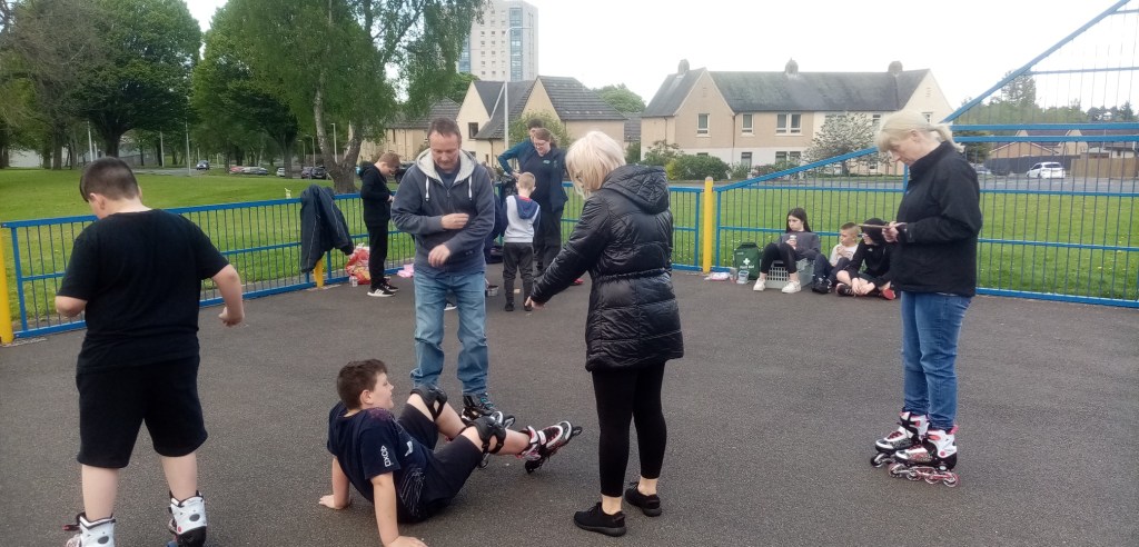 The twilight sports sessions got under way with 2 taster sessions in April with the full programme roll out starting on Friday 22nd April at the MUGA on Carradale Avenue in Tamfourhill. The lead was taken by the Falkirk Wheelers who provided excellent coaching and encouragement as the young people and often their parents joined in with the various inline skating sports on offer. TCV provided some tasty outdoor cooking activities and den building tasks. I would like to offer a special thanks to our local community Police Officers and the Fire and Rescue service from Larbert and Falkirk who turned up and got straight into the activities on offer and have built a positive relationship with the participating young people, these visits have become a highlight of the evening and are eagerly anticipated each Friday. The Twilight sports move onto Easter Carmuirs Park for the 20th & 27th May and 3rd & 10th of June where football will be the lead sport along with a bike ramps and obstacle course provided by the Falkirk Active Travel Hub and a variety of environmental learning opportunities will be provided by TCV.