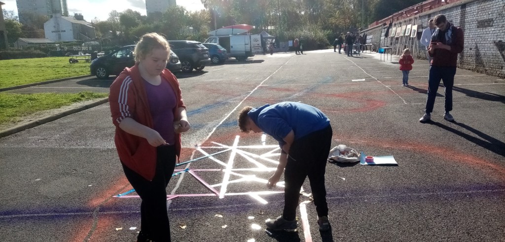 And finally: All Games Allowed is a creative initiative run by artist Mark Bleakley and Camelon Arts with support from myself that has grown out of workshops with residents on the theme of play. Come down to the MUGA on Mariner Street on Friday 27th of May from 4.30 – 7.30pm (drop-in) to play and make the final piece! The workshop will involve painting so remember to wear clothes that can get messy just in case. These workshops were enjoyed by the attending young people when they were run by Mark at the Community safety gather and play day held at the Juniors car park last October.