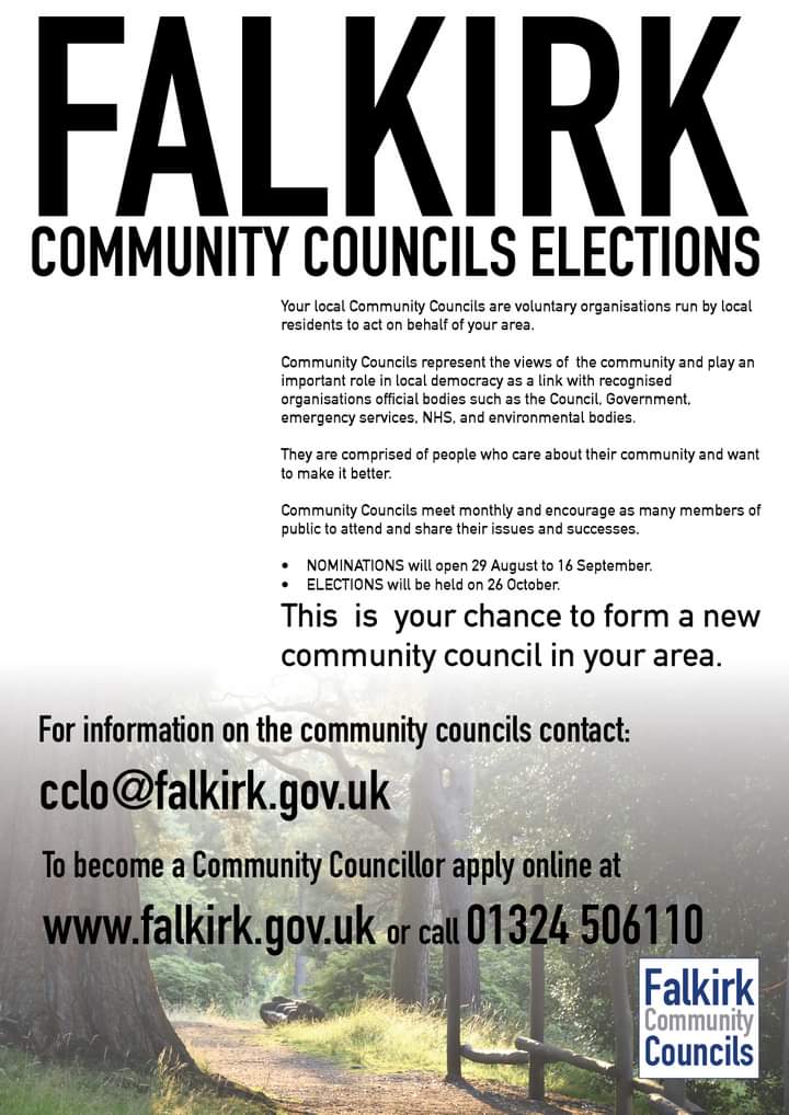 Community Council for Camelon, Tamfourhill and Bantaskin: The elections for the community council take place on 26th October, with nominations closing on the 16th September and I would encourage any interested local people to come forward and become a community councillor, the details of the nomination and election process can be found at this Falkirk Council link which is detailed on the poster below or alternatively contact me directly at communitysafetyengager@tamfourhilltro.co.uk or 07391524528 , A local community activist got in touch with me and they are working hard to encourage local people to get involved and I can put you directly in contact with that person.