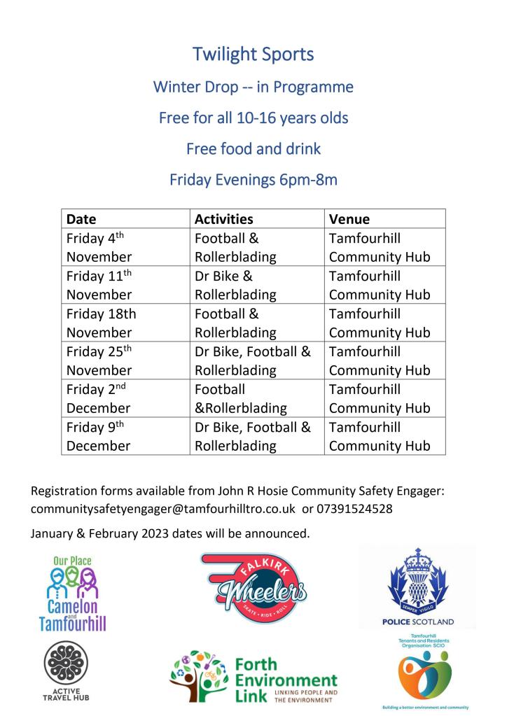 The Programme started on Friday 4th November and was very busy, we had a fabulous night of fun fitba and rollerblading. This Friday 11th November we will have Dr Bike in attendance so please bring your bikes along for a service and essential maintenance, the main sport will be rollerblading and we will be visited by our Community Safety Partners. Free for all 10-16 years old from 6pm-8pm in Tamfourhill Community Hub, a snack and drink are provided and it’s all free. Here is the full programme for November and December.