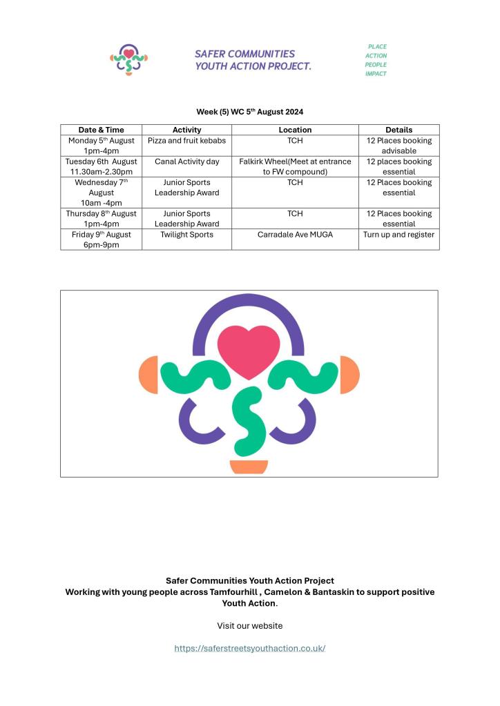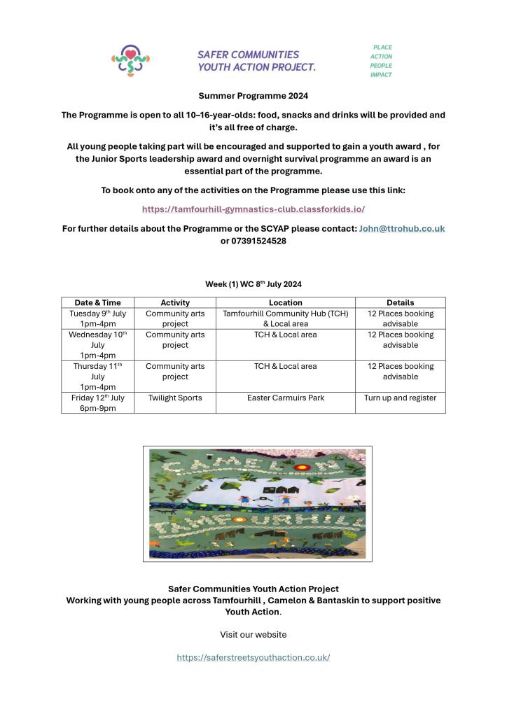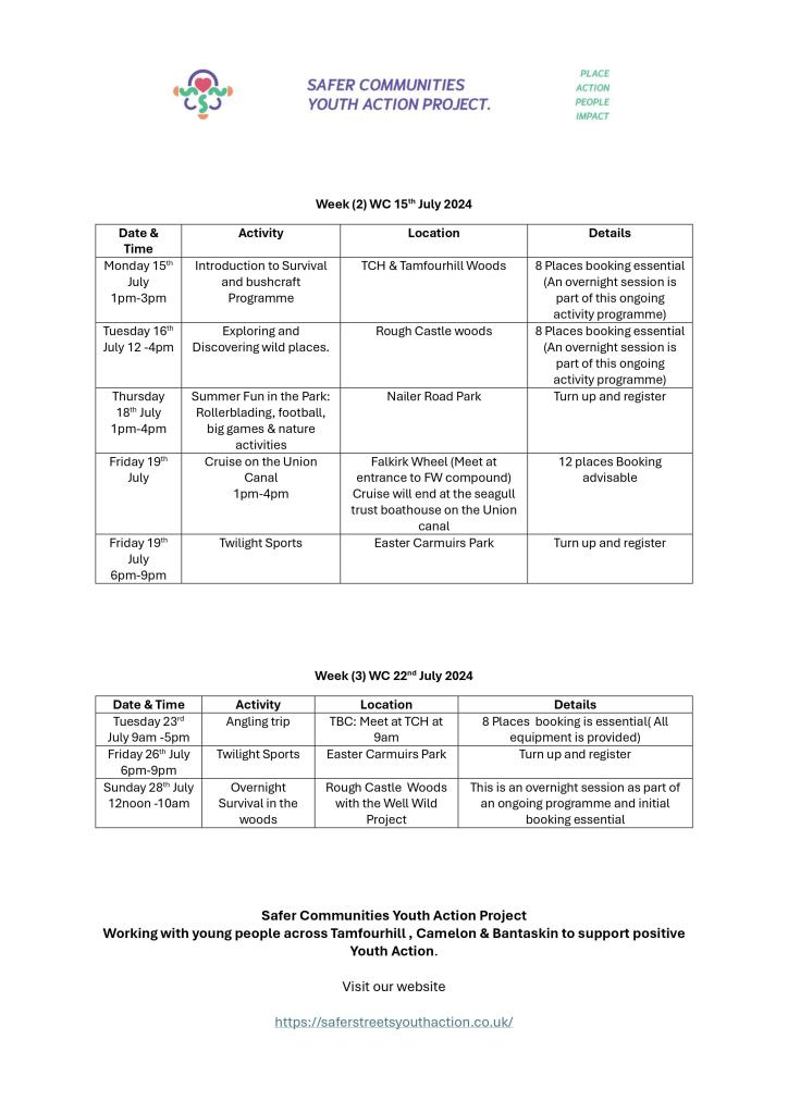 We have another summer of exciting youth action planned and much of this programme has been funded through the Scottish Governments School Holiday Food and Activity fund. There are opportunities for 12–16-year-olds to get involved with community arts projects, a junior sports leadership award, an overnight survival challenge with the Well Wild project, angling, water-based activities on the canal and some nature, conservation and cooking based activities. Every young person who is registered onto the programme will be given an opportunity to use the summer programme as the basis to gain either a High Five or Dynamic Youth Award with some of the young volunteers working towards their Youth Achievement Awards, to book onto the activities please go to this link: