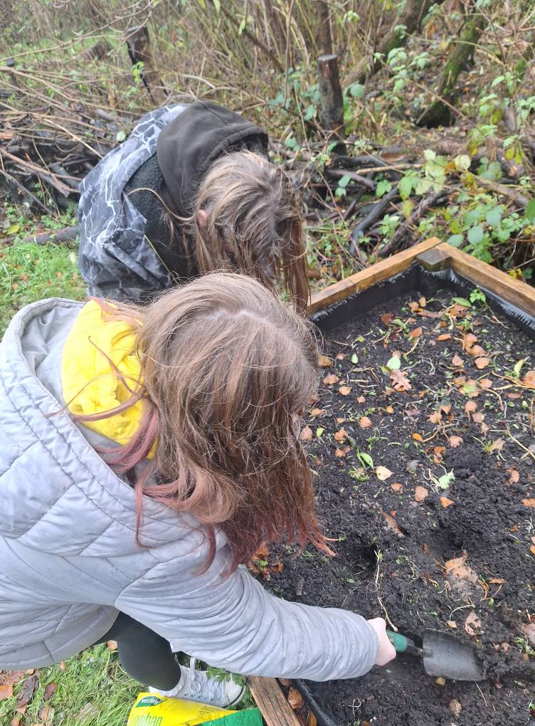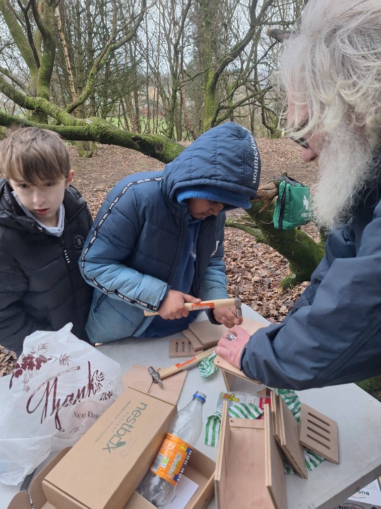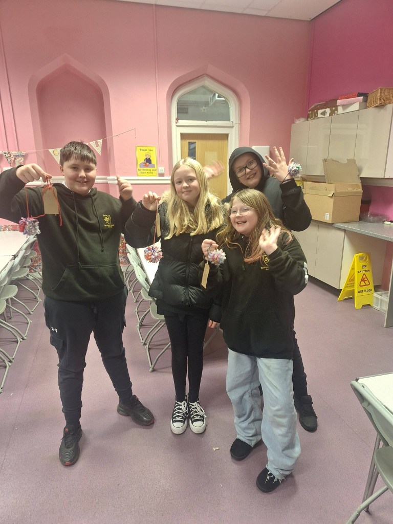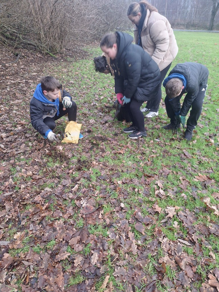 Standing up for and helping nature have been the key themes for the new year with our climate action groups at Carmuirs and Easter Carmuirs Primary Schools being out and about in the local parks and woodlands and quite often in very challenging weather conditions. Planting pollinator bulbs in Easter Carmuirs Park and the Tamfourhill woods along with making bird feeders from recycled plastic bottles and some toad abodes in the Well Wild Woods have been the key activities for this month. We are always keen to encourage creativity and the arts in all aspects of the SCYAP, so we very much enjoyed the pom poms workshops that were carried out by Sarah our community artist. This involved every young person attaching labels to their pom poms stating a personal commitment to take climate action, and these included: Planting a tree in the garden, organising a litter pick, using less plastic and having their own drinks bottles to avoid single use plastics.